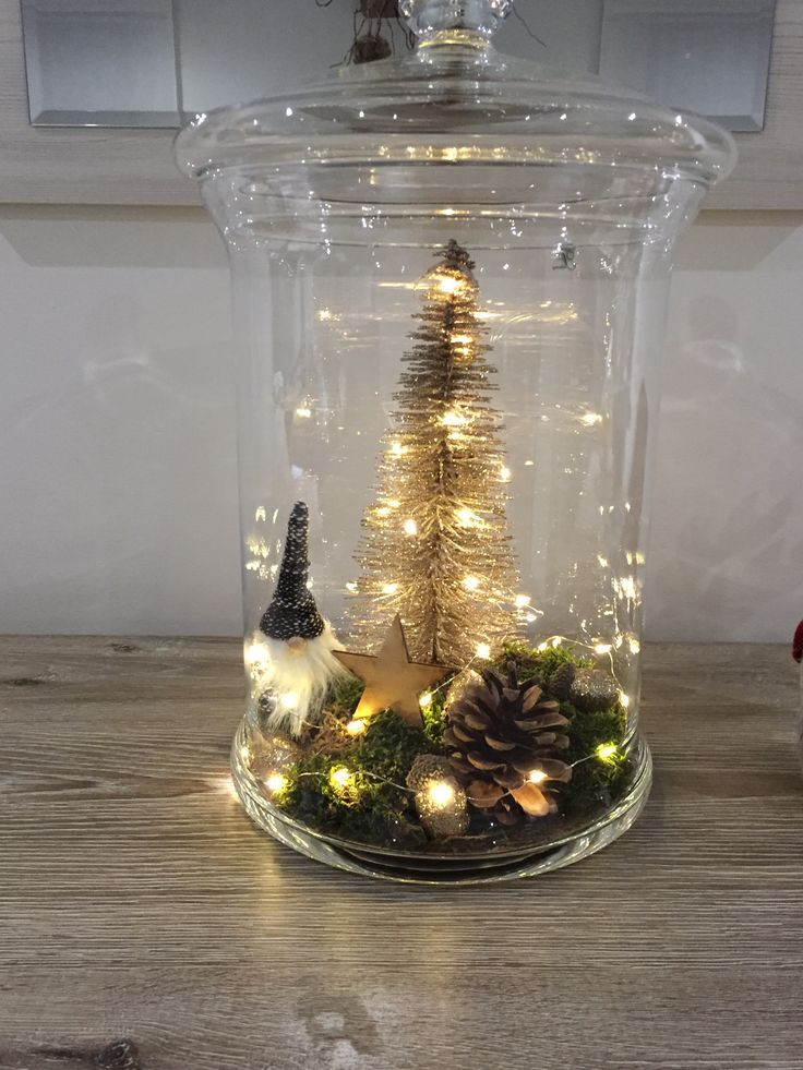 Start by adding moss at the bottom of your vase. Then, place a bottle brush Christmas tree, a small gnome, pine cones, and string lights.
