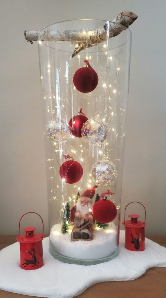 Add fake snow to the bottom of your vase. Then, place a mini Santa and Christmas trees on it. Put a branch on the top of your vase. Add string lights and tie red and silver Christmas balls to the branch.