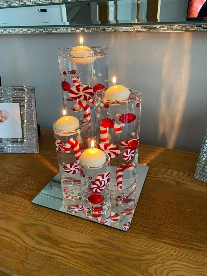 Add candy canes as well as red and white beads in your vase. Then, pour water in it. Lastly, place a white floating candle on top.