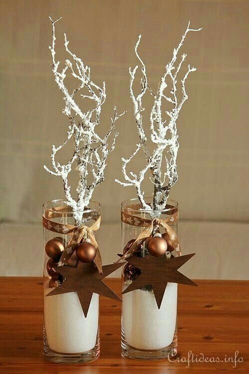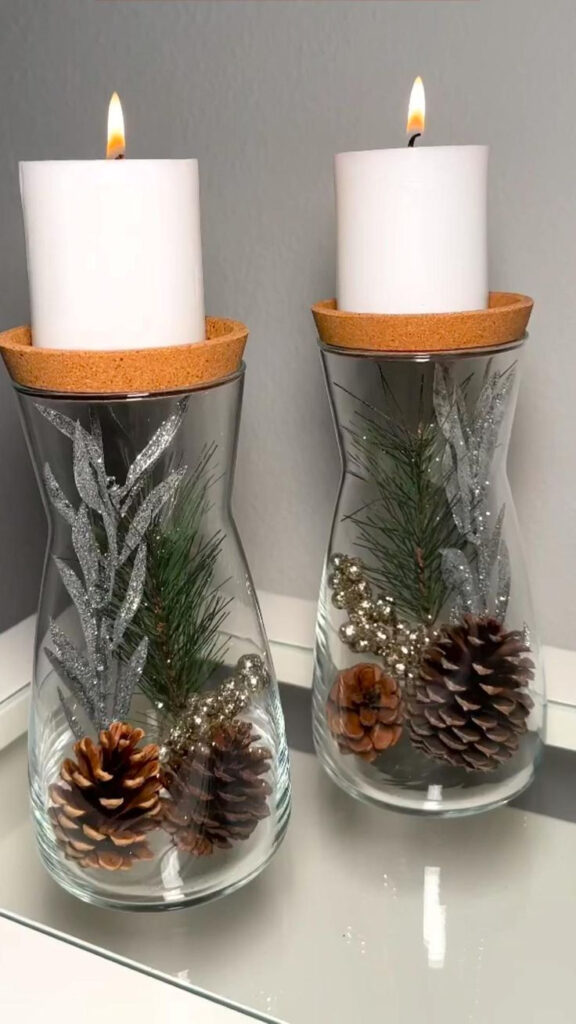 Vases can be filled with Christmas balls, natural elements, fake snow, and string lights. Creating warm and cheerful centerpieces that are perfect for Christmas.