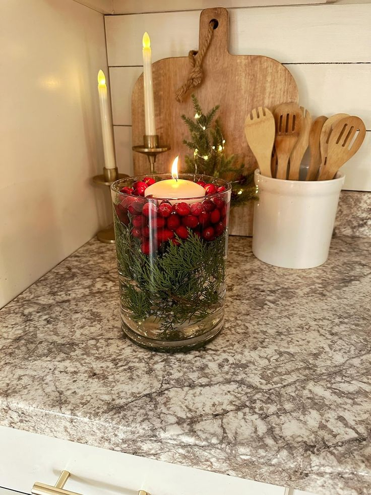 Simply add pine branches and red berries to your glass vase. Then, pour water in it. Lastly, place a white floating candle.