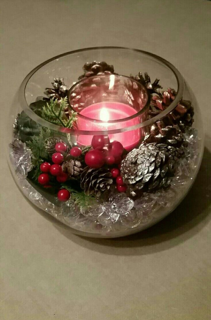 Place faux crystals at the bottom of your glass vase. Then, add pine branches, pine cones, and red berries on top. Lastly, put a red candle in your vase.