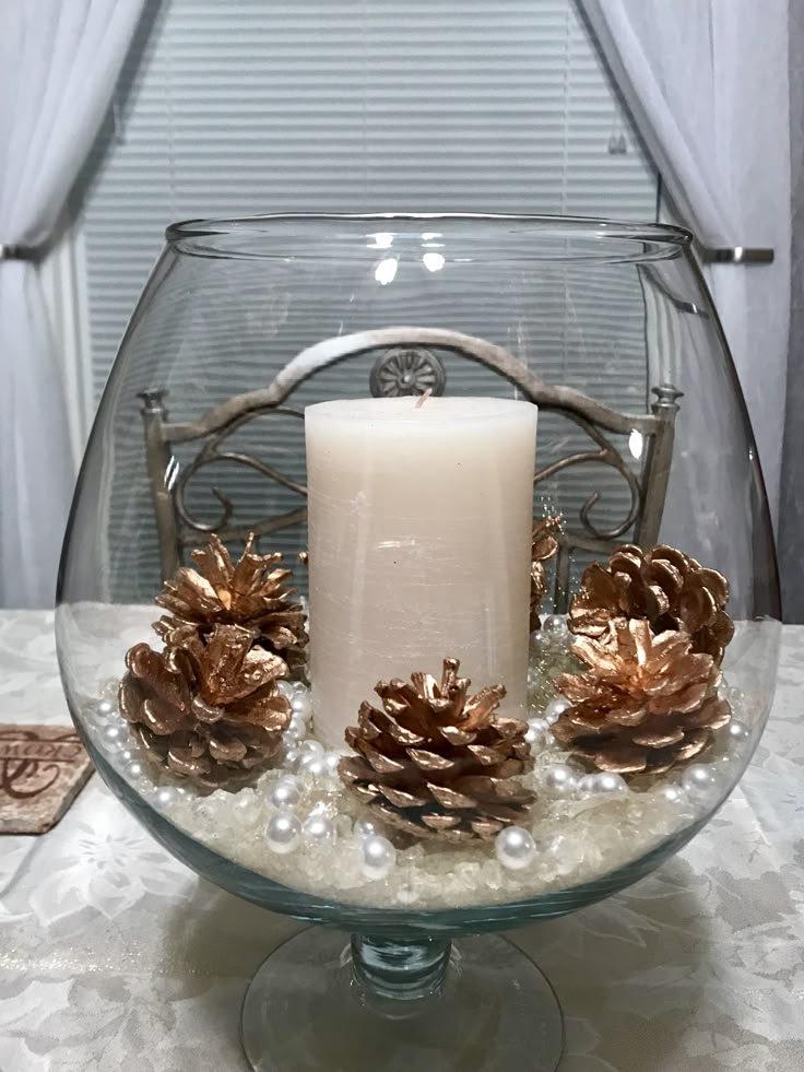 Fill a glass vase with pearls. Then, add pine cones and a white candle. This refined Christmas vase will give a warm and sophisticated touch to your space.