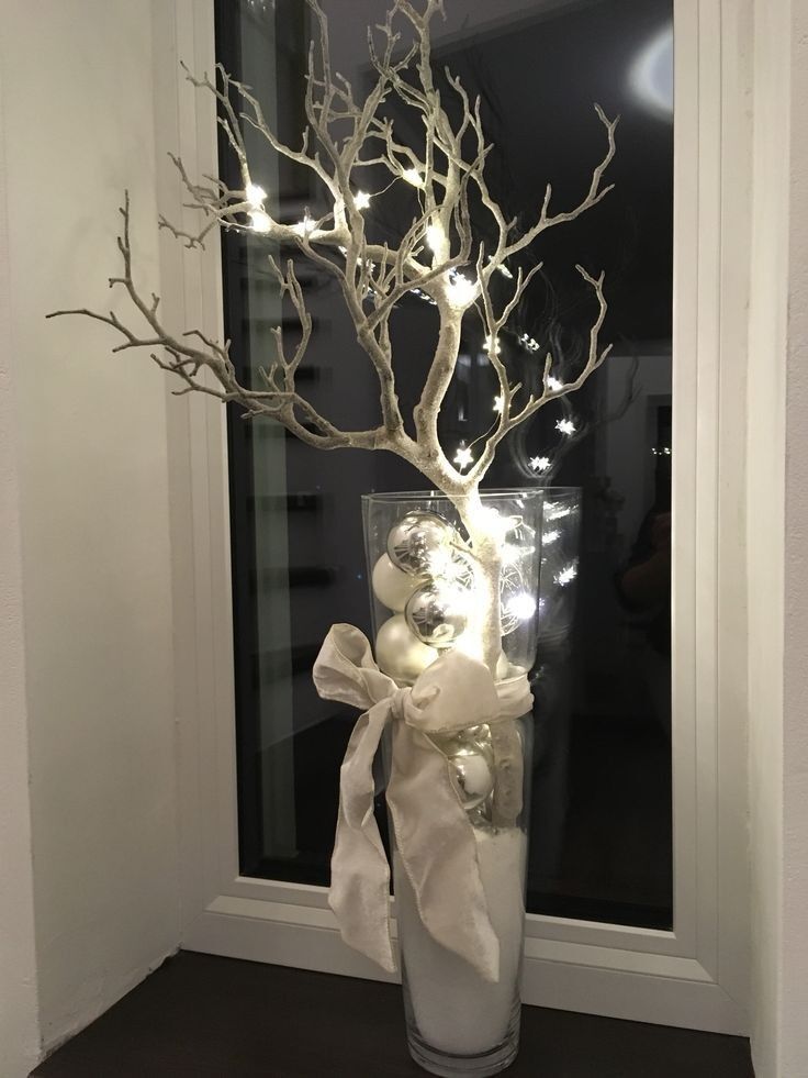 Add fake snow at the base of your vase. Then, place silver and white Christmas balls in it. Lastly, add a large branch that goes above your vase.