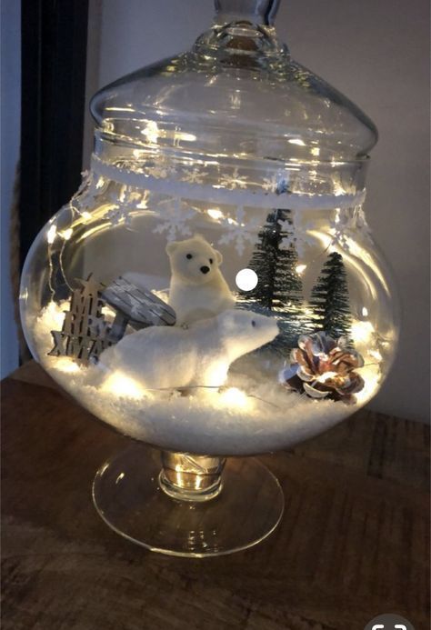 Add fake snow at the bottom of your vase. Then, place polar bears, bottle brush Christmas trees, pine cones, and string lights.