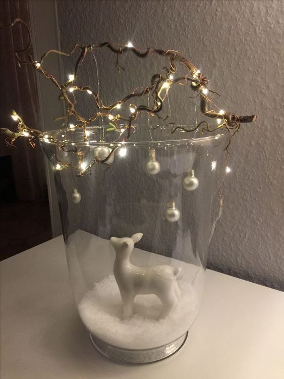 Put fake snow and a white reindeer at the base of your vase. Then, add a branch on the top of your vase. Add string lights and tie white pearls to the branch.