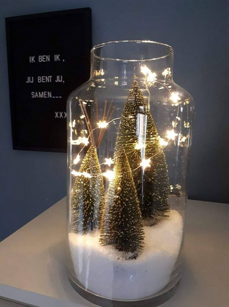 Start by taking a glass vase. Then, add fake snow. Place three bottle brush Christmas trees on top. Lastly, add string lights.